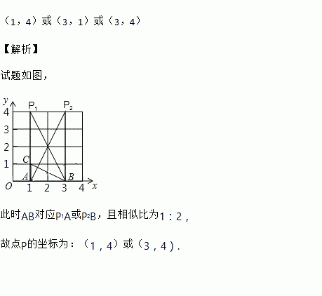 如图,在已建立直角坐标系的4×4的正方形方格纸中,△ABC是格点三角形(三角形的三个顶点都是小正方形的顶点),若以格点P、A、B为顶点的三角形与△ABC相似(C点除外),则格点P的坐标是_____.