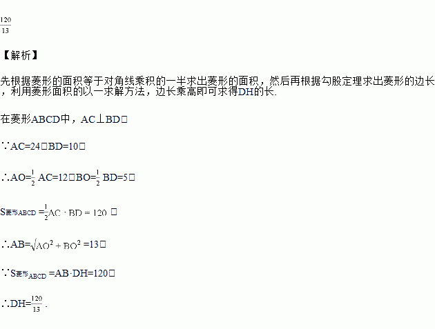 如图,四边形ABCD是菱形,AC=24, BD=10,DH⊥AB 于点H,求菱形的面积及线段DH的长.