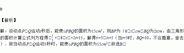 如图,在△ABC中,∠ABC=90°,AB=8cm,BC=6cm.动点P,Q分别从点A,B同时开始移动,点P的速度为1cm/秒,点Q的速度为2cm/秒,点Q移动到点C后停止,点P也随之停止运动.下列时间瞬间中,能使△PBQ的面积为15cm2的是( )