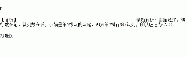 体育课上,七年级某班49名同学在操场上练习正方形方队,他们站成7×7方队,每横队7人,每纵队7人,小敏在第2纵队的排头,记为(1,2),小娟在第5纵队的队尾,则小娟的位置应记为( )