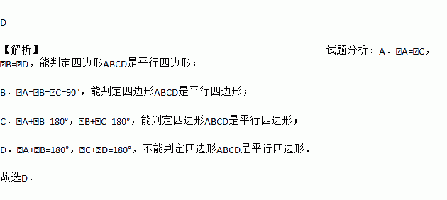 C. ∠A+∠B=180°,∠B+∠C=180° D. ∠A+∠B=180°,∠C+∠D=180°