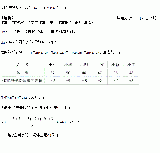 (1)见解析;(2)14公斤;(3)43公斤; 【解析】试题分析:(1)由平均体重,再根据各名学生体重与平均体重的差值即可填表; (2)找出最重和最轻的体重,直接相减即可. (3)用6位同学的体重和除以6即可. 试题解析:【解析】 (1)40﹣45=﹣5,45+2=47,36﹣45=﹣9,48﹣45=3,填表如下: (2)5﹣(﹣9)=14(公斤); 故最重的...