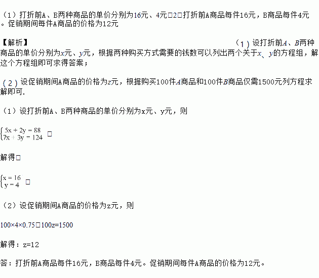 (2)若B商品所打折扣为7.5折,求促销期间每件A商品的价格。