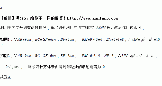 如图是放在地面上的一个长方体盒子,其中AB=9cm,BC=6cm,BF=5cm,点M在棱AB上,且AM=3cm,点N是FG的中点,一只蚂蚁要沿着长方体盒子的表面从点M爬行到点N,它需要爬行的最短路程为( )