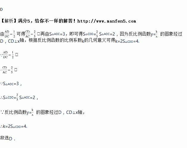 如图,Rt△AOC的直角边OC在x轴上,∠ACO=90°,反比例函数y=(x>0)的图象与另一条直角边相C交于点D,,S△AOC=3,则k=( )