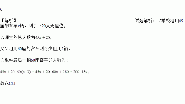 某校组织若干师生到恩施大峡谷进行社会实践活动.若学校租用45座的客车x辆,则余下20人无座位;若租用60座的客车则可少租用2辆,且最后一辆还没坐满,则乘坐最后一辆60座客车的人数是( )