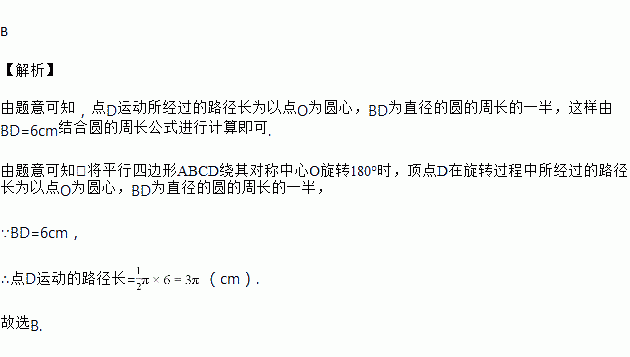 如图,平行四边形ABCD的对角线BD=6cm,若将平行四边形ABCD绕其对称中心O旋转180°,则点D在旋转过程中所经过的路径长为( )