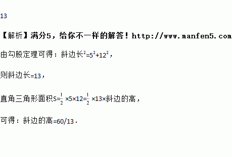 一个直角三角形的两条直角边的长分别为5cm和12cm,则斜边长为____cm.