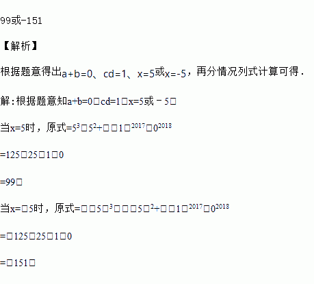 已知a,b互为相反数,c,d互为倒数,x的绝对值为5,求:x3﹣x2+(﹣cd)2017﹣(a+b)2018的值.