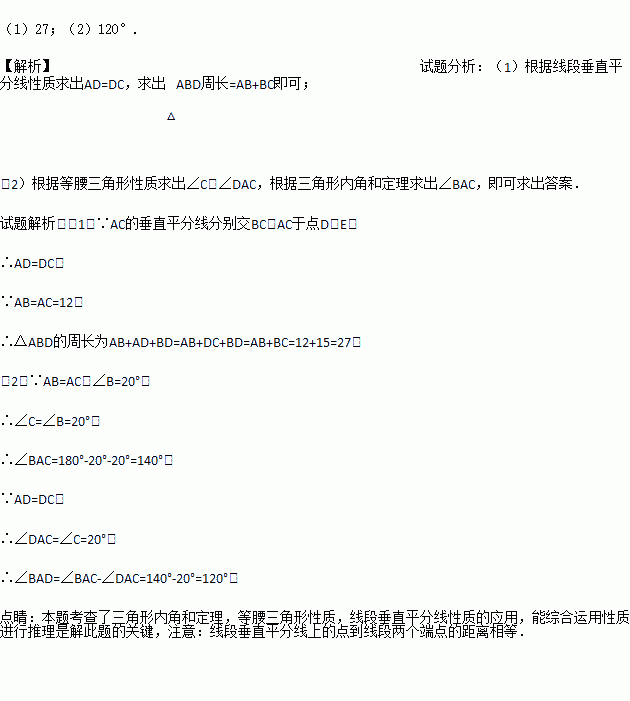 (1)若AC=12,BC=15,求△ABD的周长;