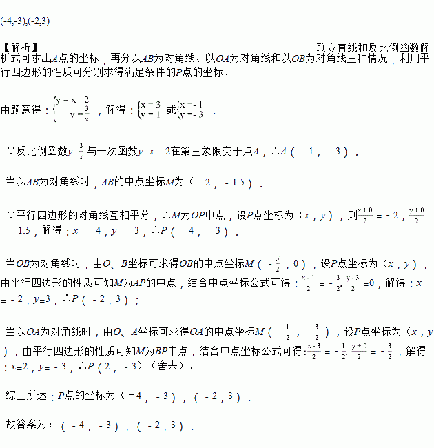 如图,反比例函数与一次函数在第三象限交于点.点的坐标为(一3,0),点是轴左侧的一点.若以为顶点的四边形为平行四边形.则点的坐标为_____________.