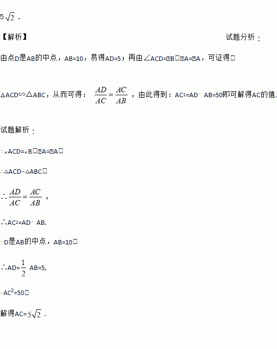 如图,已知在△ABC中,D是AB的中点,且∠ACD=∠B,若 AB=10,求AC的长.