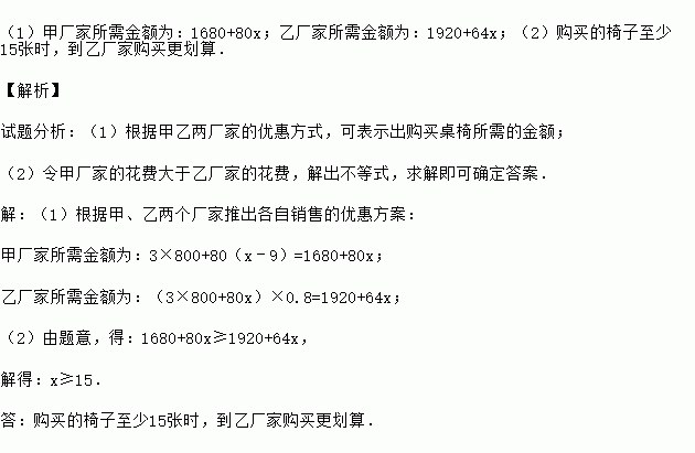 甲、乙两个厂家生产的办公桌和办公椅的质量、价格一致,每张办公桌800元,每张椅子80元.甲、乙两个厂家推出各自销售的优惠方案,甲厂家:买一张桌子送三张椅子;乙厂家:桌子和椅子全部按原价8折优惠.现某公司要购买3张办公桌和若干张椅子,若购买的椅子数为x张(x≥9).