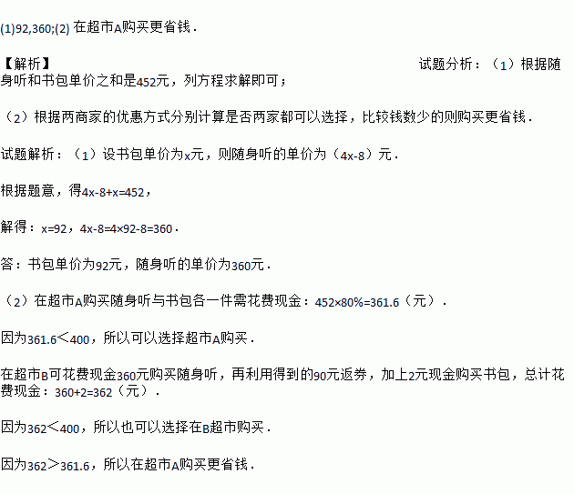 (1)92,360;(2) 在超市A购买更省钱. 【解析】试题分析:(1)根据随身听和书包单价之和是452元,列方程求解即可; (2)根据两商家的优惠方式分别计算是否两家都可以选择,比较钱数少的则购买更省钱. 试题解析:(1)设书包单价为x元,则随身听的单价为(4x-8)元. 根据题意,得4x-8+x=452, 解得:x=92,4x-8=4×92-8=360. ...