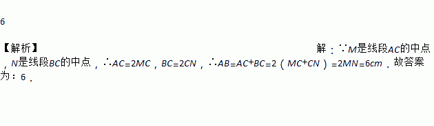 如图, 是线段上一点,M是线段的中点,N是线段BC的中点且MN=3cm,则的长为cm.