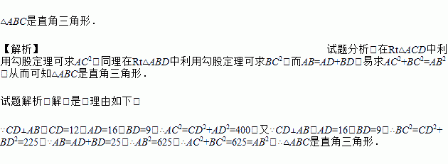 如图,在Rt△ABC中,CD⊥AB,垂足为D,如果CD=12,AD=16,BD=9,那么△ABC是直角三角形吗?请说明理由.