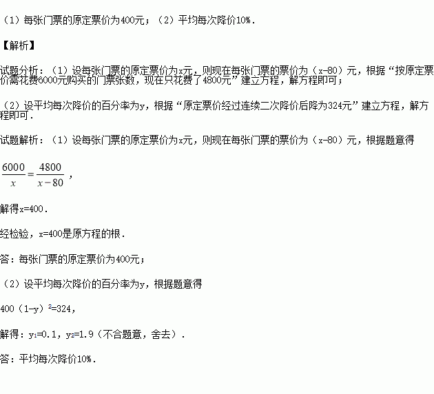(2)根据实际情况,活动组织单位决定对于个人购票也采取优惠政策,原定票价经过连续二次降价后降为324元,求平均每次降价的百分率.