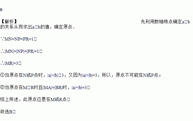 如图,M,N,P,R分别是数轴上四个整数所对应的点,其中有一点是原点,并且MN=NP=PR=1.数a对应的点A在M与N之间,数b对应的点B在P与R之间,若|a|+|b|=3,则原点是( )