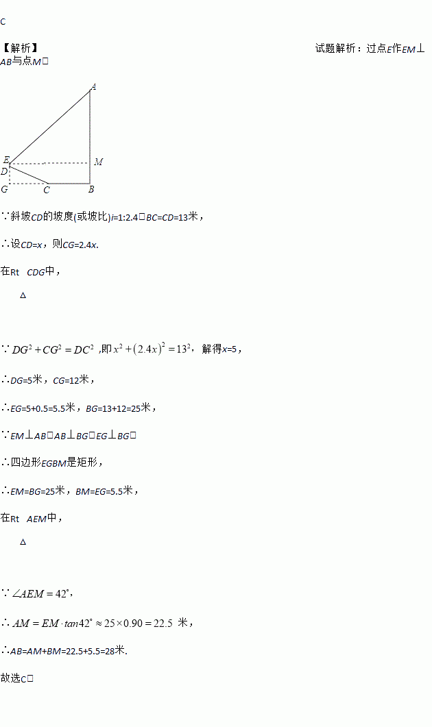 位于南岸区黄桷垭的文峰塔,有着“平安宝塔”之称.某校数学社团对其高度 AB进行了测量.如图,他们从塔底A的点B出发,沿水平方向行走了13米,到达点C,然后沿斜坡CD继续前进到达点D处,已知DC=BC.在点D处用测角仪测得塔顶A的仰角为42°(点A,B,C,D,E在同一平面内).其中测角仪及其支架DE高度约为0.5米,斜坡CD的坡度(或坡比)i=1:2.4,那么文峰塔的高度AB约为( )(sin42°≈0.67,cos42°≈0.74,tan42°≈0.90)