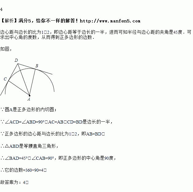 若正多边形的边心距与边长的比为,则这个正多边形的边数是________.