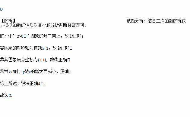 .下列说法:①其图象的开口向上;②其图象的对称轴为直线x=3;③其图象顶点坐标为(3,1);④当x<3时,y随x的增大而减小.则其中说法正确的有( )