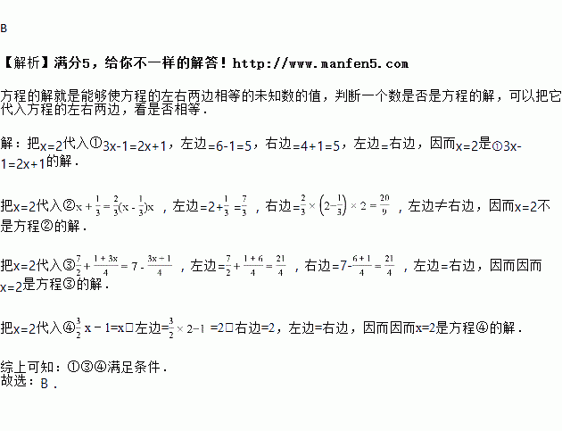 已知方程:①3x﹣1=2x+1,② ,③ ,④x﹣1=x中,解为x=2的是方程( )