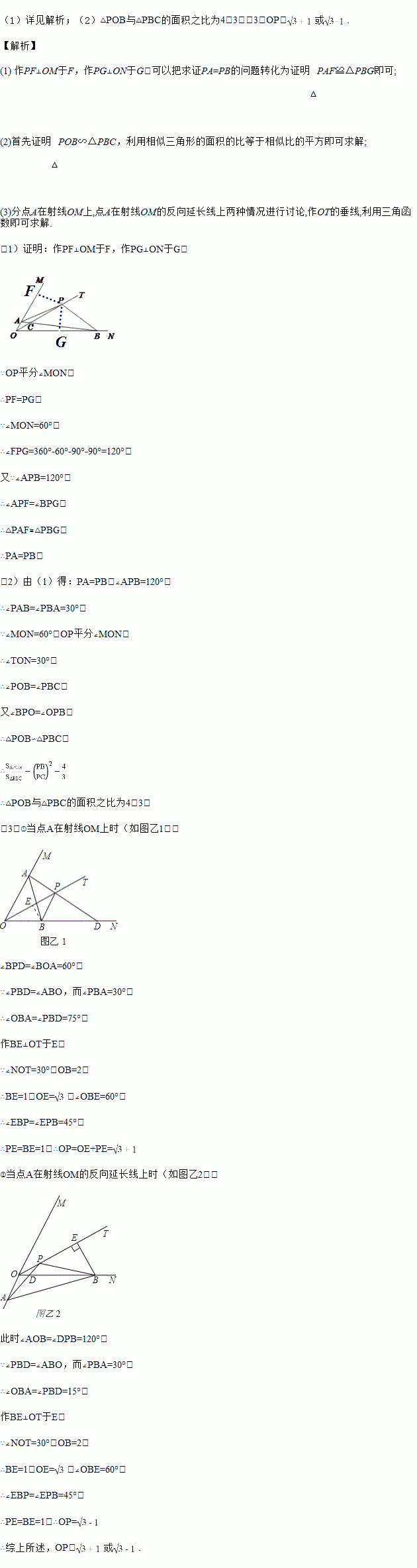 (1)如图,若射线PB绕点P顺时针旋转120°后与射线OM交于点A,求证:PA=PB;
