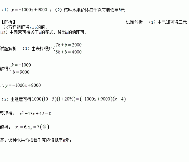 ijˮ¹û¾ÏúÉÌÉÏÔ·ÝÏúÊÛÒ»ÖÖÐÂÉÏÊеÄË®¹û£¬Æ½¾ùÊÛ¼ÛΪ10Ôª/ǧ¿Ë£¬ÔÂÏúÊÛÁ¿Îª1000ǧ¿Ë.¾Êг¡µ÷²é£¬Èô½«¸ÃÖÖË®¹û¼Û¸ñµ÷µÍÖÁxÔª/ǧ¿Ë£¬Ôò±¾Ô·ÝÏúÊÛÁ¿y£¨Ç§¿Ë£©Óëx£¨Ôª/ǧ¿Ë£©Ö®¼ä·ûºÏÒ»´Îº¯Êý¹ØÏµ£¬²¢Çҵõ½Á˱íÖеÄÊý¾Ý£º