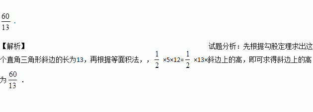 直角三角形两直角边长分别为5和12,则它斜边上的高为_______.