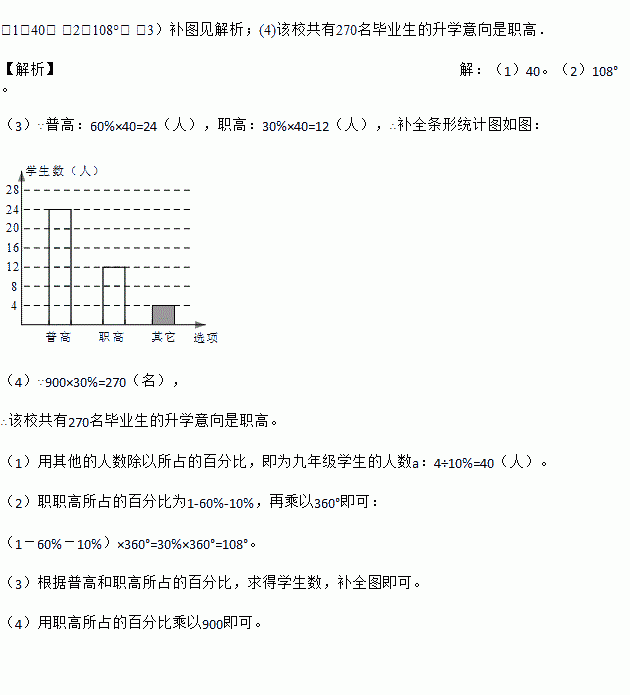 (4)若该校九年级有学生900名,估计该校共有多少名毕业生的升学意向是职高.