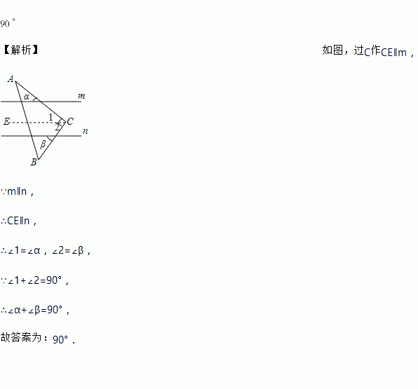 如图,,直角三角板ABC的直角顶点C在两直线之间,两直角边与两直线相交所形成的锐角分别为、,则______.