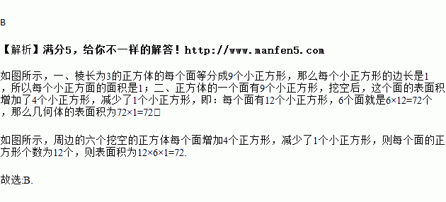 个小正方形,然后沿每个面正中心的一个正方形向里挖空(相当于挖去![]()