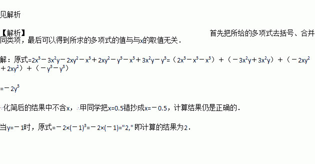 在计算代数式(2x3-3x2y-2xy2)-(x3-2xy2+y3)+(-x3+3x2y-y3)的值,其中x=0.5,y= -1时,甲同学把x=0.5错抄成x= -0.5,但他计算的结果是正确的.试说明理由,并求出这个结果.
