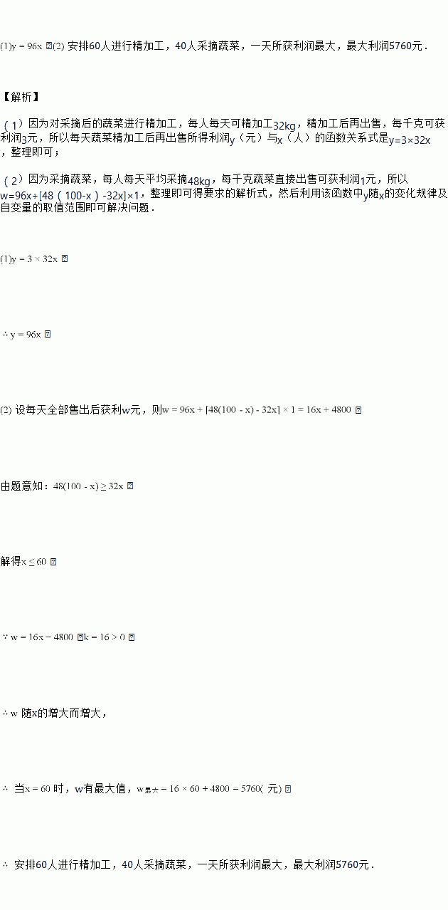 某蔬菜基地加工厂有工人100人,现对100人进行工作分工,或采摘蔬菜,或对当日采摘的蔬菜进行精加工,每人每天只能做一项工作,若采摘蔬菜,每人每天平均采摘48kg;若对当日采摘的蔬菜进行精加工,每人每天可精加工每天精加工的蔬菜和没来得及精加工的蔬菜全部售出![]()
