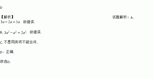 D 【解析】试题解析:A. 故错误. B. 故错误. C. 不是同类项不能合并. D.正确. 故选D.