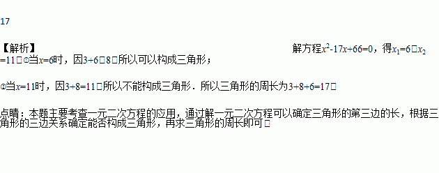 已知三角形的两边长分别是3和8,第三边的数值是一元二次方程x2-17x+66=0的根则此三角形的周长为_______.