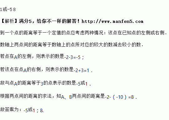 已知点A在数轴上表示的数是-2,则与点A的距离等于3的点表示的数是_______,若点B表示的数为-10,则A、B两点间的距离是___________