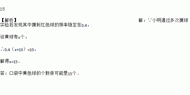 一个口袋中装有10个红球和若干个黄球.在不允许将球倒出来数的前提下,为估计口袋中黄球的个数,小明采用了如下的方法:每次先从口袋中摸出10个球,求出其中红球数与10的比值,再把球放回口袋中摇匀.不断重复上述过程20次,得到红球数与10的比值的平均数为0.4.根据上述数据,估计口袋中大约有 个黄球