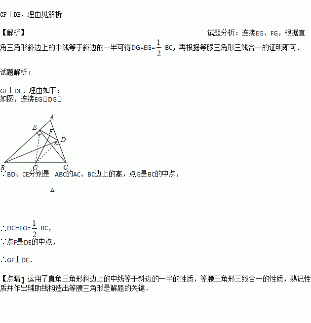 如图,在△ABC中,BD、CE是高,G、F分别是BC、DE的中点,连接GF,试判断GF与DE有何特殊的位置关系?请说明理由.