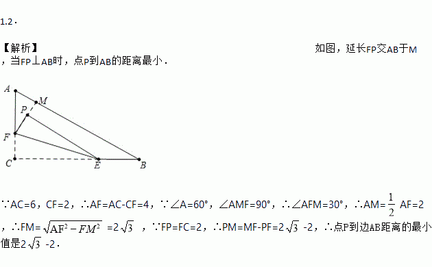 如图,在Rt△ABC中,∠C=90°,AC=6,BC=8,点F在边AC上,并且CF=2,点E为边BC上的动点,将△CEF沿直线EF翻折,点C落在点P处,则点P到边AB距离的最小值是 .