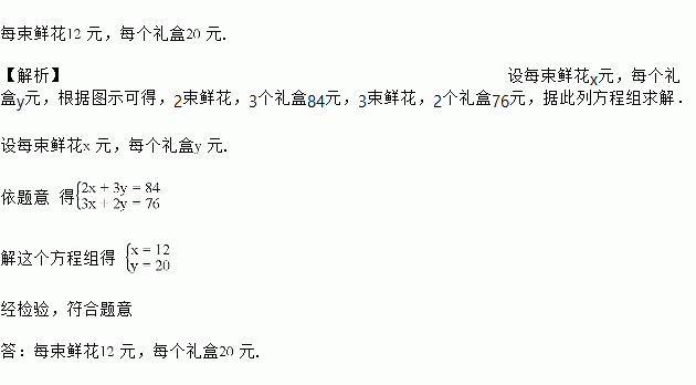 五月份的第二个星期天是母亲节.如图,母亲节那天,很多同学给妈妈准备了鲜花和礼盒,根其图中提供信息,求每束鲜花和每个礼的价格。