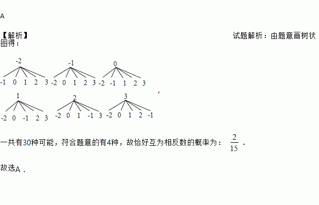 在﹣2、﹣1、0、1、2、3这六个数中,任取两个数,恰好互为相反数的概率为( )