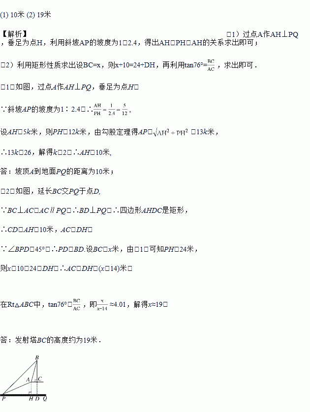 如图,在合肥大蜀山山顶有一斜坡AP的坡度为1∶2.4,坡长AP为26米,在坡顶A处的同一水平面上有一座安徽卫视发射塔BC,在斜坡底P处测得该塔的塔顶B的仰角为45°,在坡顶A处测得该塔的塔顶B的仰角为76°,求: