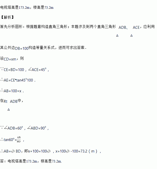如图所示,某电视塔AB和楼CD的水平距离为100米,从楼顶C处及楼底D处测得塔顶A的仰角分别为45°和60°,试求塔高和楼高.