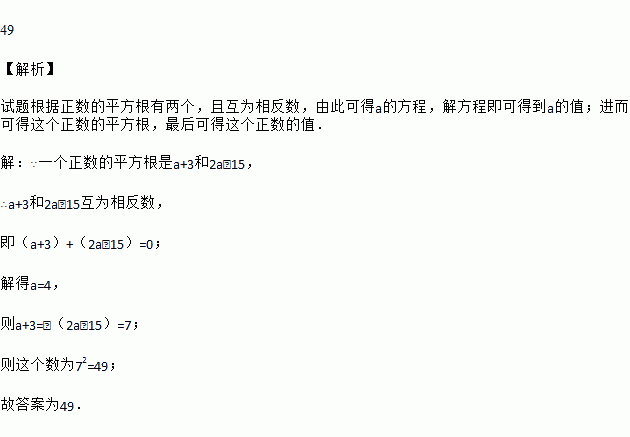 若一个数的两个平方根分别是a+3和2a-15,则这个数为_________.