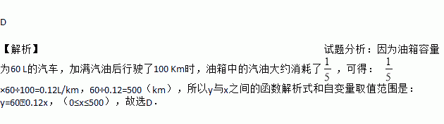 D 【解析】试题分析:因为油箱容量为60 L的汽车,加满汽油后行驶了100 Km时,油箱中的汽油大约消耗了,可得: ×60÷100=0.12L/km,60÷0.12=500(km),所以y与x之间的函数解析式和自变量取值范围是:y=60﹣0.12x,(0≤x≤500),故选D.