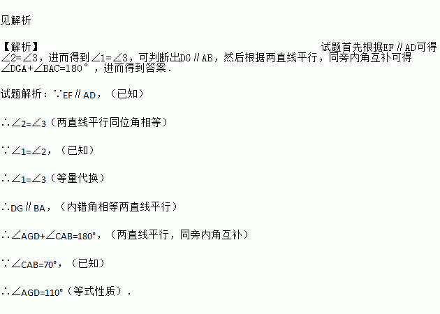 如图,已知点D、F、E、G都在△ABC的边上,EF∥AD,∠1=∠2,∠BAC=70°,求∠AGD的度数.(请在下面的空格处填写理由或数学式)