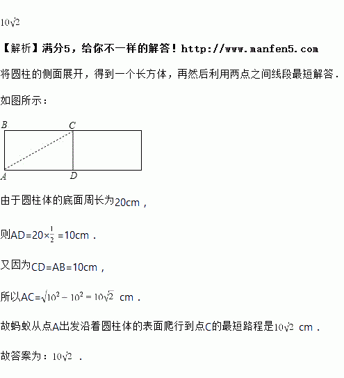 如图所示,圆柱体的底面周长为20cm,高为10cm,![]()