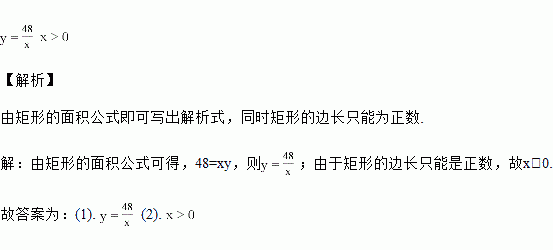 若矩形的面积为,它的两边长分别为,.则关于的函数解析式为________,其中自变量的取值范围是________.