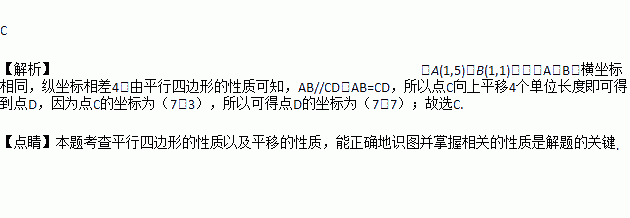 如图,□ABCD的顶点坐标分别为A(1,5)、B(1,1)、C(7,3),则点D的坐标为( )